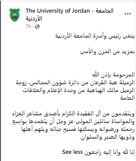 ونعى رئيس الجامعة الأردنية، وأسرة الجامعة الراحلة القرعان سائلين الله أن يتغمد روحها الجنة، وأن يلهم ذويها الصبر والسلوان.