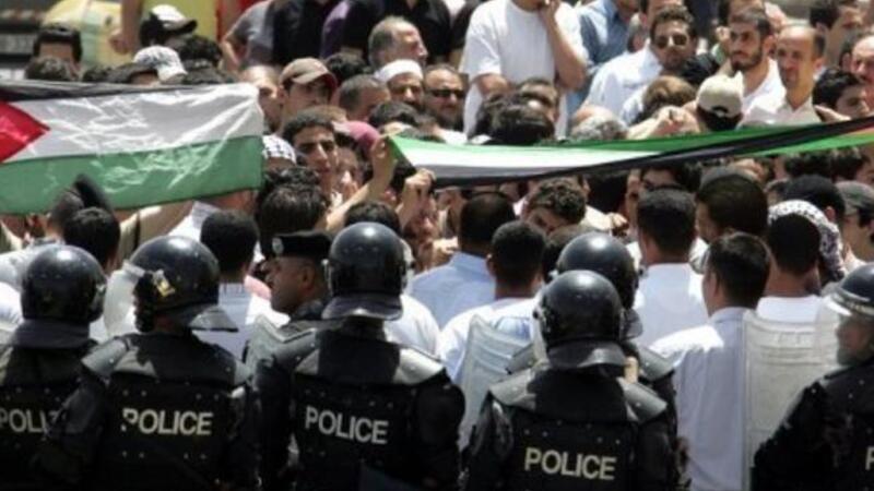 وتجمع المتظاهرون بالقرب من المسجد الحسيني الكبير وسط عمان وهم يحملون لافتات كتب عليها "من يقاتل الصهاينة مكانه ليس الزنازين (السجون)" و "آن أوان الافراج عن ابنائنا المعتقلين".