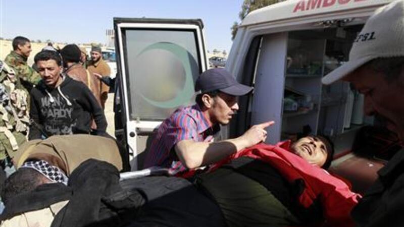 مقاتلون ينقلون زميلا لهم أصيب في اجدابيا يوم الأحد