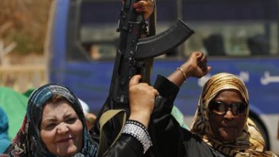 امراة تطلق النار في الهواء خلال حضورها مع نساء اخريات دورة تدريب في مدينة بني وليد شرق طرابلس