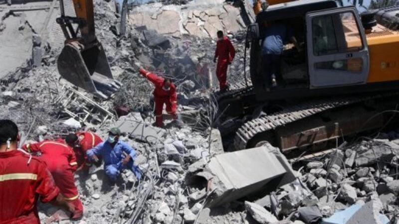 صورة التقطت خلال جولة تحت اشراف السلطات لعمال اغاثة يتفقدون حطام مبان في صرمان غرب طرابلس