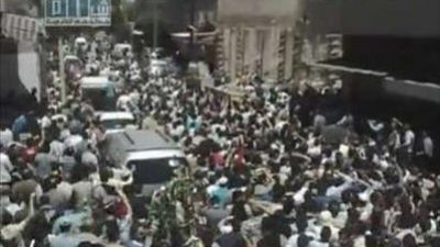 وافاد احد الشهود من مدينة سقبا في ريف دمشق ان اكثر من عشرة الاف شخص شاركوا في تشييع جنازة شخص قتل البارحة في المدينة وهم يرددون هتافات تدعو الى اسقاط النظام، ولكن رجال الامن الموجودين لم يتدخلوا.