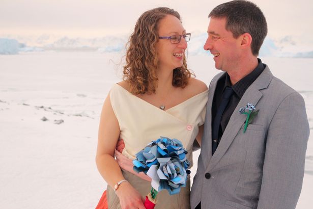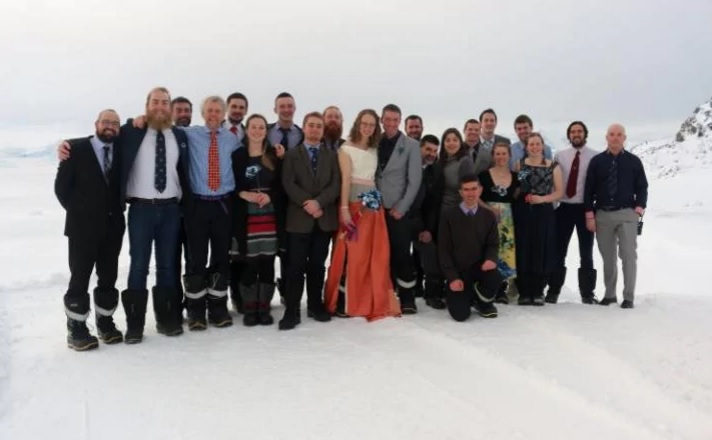 ونشر الزوجان، اللذان يعملان في مجال البعثات الإستكشافية التابعة للمشروع البريطاني لمراقبة القطب الجليدي، صورًا لحفل الزفاف.