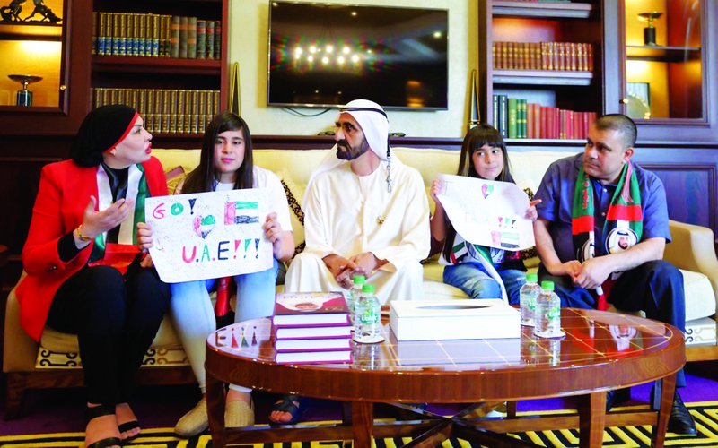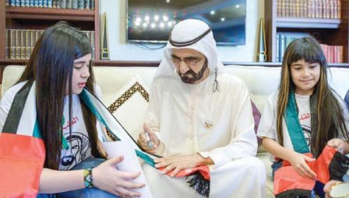 وقام بن راشد، باحتضان الطفلة سارة عند دخولها مكتبه كما أهداها نسخة من كتاب سموه "قصتي"، كما حظيت سارة كذلك بتوقيع سموه على العلم الذي قبلته، لهيامها وحبها للإمارات.