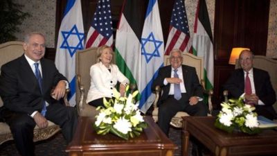 ميتشل، عباس، كلينتون، نتنياهو في صورة تذكارية قبيل بدء جولة المفاوضات في شرم الشيخ/أ.ف.ب