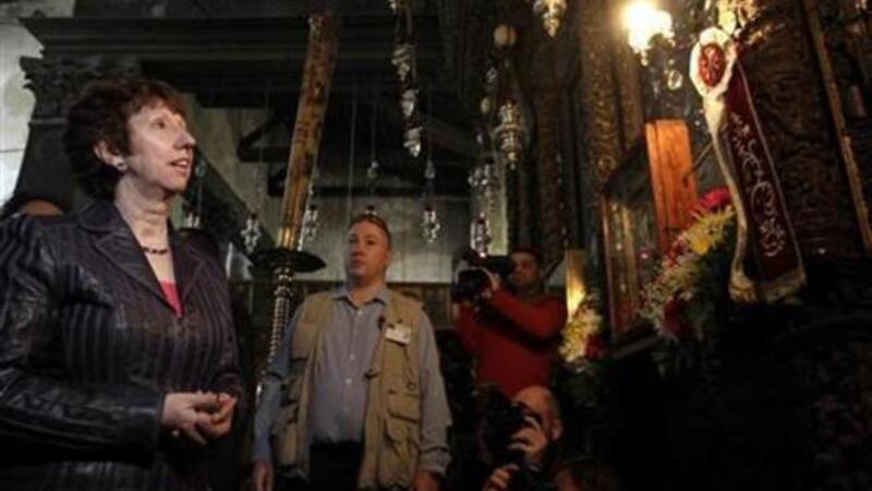 وزارت اشتون كنيسة المهد في بيت لحم حيث سيحتفل المسيحيون الارثوذكس والاقباط والكنيسة الاثيوبية بعيد الميلاد.
