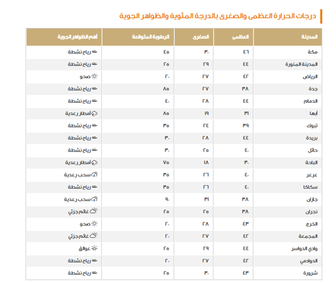 من الجدير الإشارة إلى أن المركز الوطني للأرصاد قد نوّه في بيانه على أن درجات الحرارة في السعودية اليوم سوف تشهد ارتفاعًا ملحوظًا بالأخص على مناطق محددة من شرق المملكة، وهي ما ستأتي على النحو التالي: