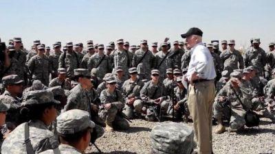 وكان اجرى محادثات امس الخميس في بغداد مع رئيس الوزراء نوري المالكي والرئيس جلال طالباني ونائب رئيس الوزراء صالح المطلك وحضهم على اكمال تشكيلة الحكومة وما يحتاجه استقرار الاوضاع الامنية، وفقا لمصدر رفيع مرافق للوفد. كما التقى قبل ذلك نحو 200 جندي من اللواء الذي يتولى مهام التدريب وتقديم المساعدة للقوات العراقية، في قاعدة ليبرتي، غرب بغداد.