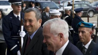 وزير الدفاع الاميركي روبرت غيتس ولاى يمينه نظيره الاسرائيلي ايهود باراك في واشنطن