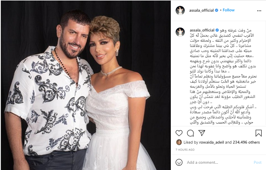 شاركت الفنانة أصالة جمهورها بصورة لها عبر موقع التغريدات  (توتير) جمعتها  بزوجها الشاعر فائق حسن، حيث بدت بمنتهى السعادة وهي بين أحضانه في لحظات رومانسية.