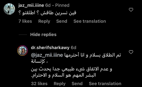 وكتب أحد متابعي شريف شرقاوي تعليقا قائلا: (فين نسرين طافش... اطلقتو؟)، ليجيب عليه قائلا:( تم الطلاق بسلام وأنا أحترمها كإنسانة.. وعدم الاتفاق شيء طبيعي جدا يحدث بين البشر .. المهم هو السلام والاحترام).