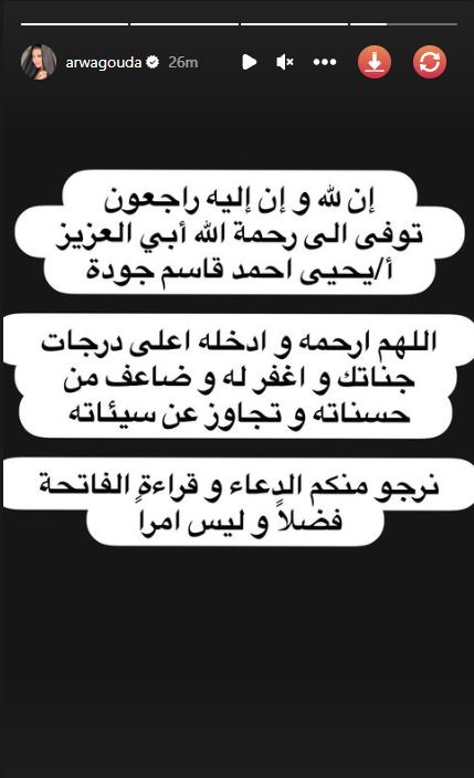 البوابة-أعلنت النجمة أروى جودة وفاة والدها السيد يحيى جودة. و كتبت أروى عبر خاصية (ستوري) بحسابها على موقع (فيسبوك): (إن لله وإن إليه راجعون، توفي إلى رحمة الله أبي العزيز أ/يحيى أحمد قاسم جودة، اللهم ارحمه وأدخله أعلى درجات جناتك، واغفر له وضاعف من حسناته وتجاوز عن سيئاته)، و تابعت: (نرجوا منكم الدعاء وقراءة الفاتحة، فضلا وليس أمرا).
