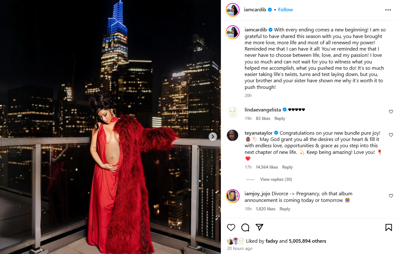"مع كل نهاية تأتي بداية جديدة! أنا ممتنة جدا لمشاركتي هذا الموسم معك، لقد جلبت لي المزيد من الحب والمزيد من الحياة والأهم من ذلك كله تجديد قوتي!" وكتبت كاردي في تعليقها إلى جانب بعض الصور لنفسها وهي ترتدي فستانا أحمر اللون من "ماجدا برتريم" وتكشف بطنها. "ذكرني أنه يمكنني الحصول على كل شيء! لقد ذكرتني أنه ليس علي الاختيار بين الحياة والحب وشغفي! أحبك كثيرًا ولا أستطيع الانتظار حتى تشهد ما ساعدتني على تحقيقه، وما لقد دفعتني إلى القيام بذلك!"