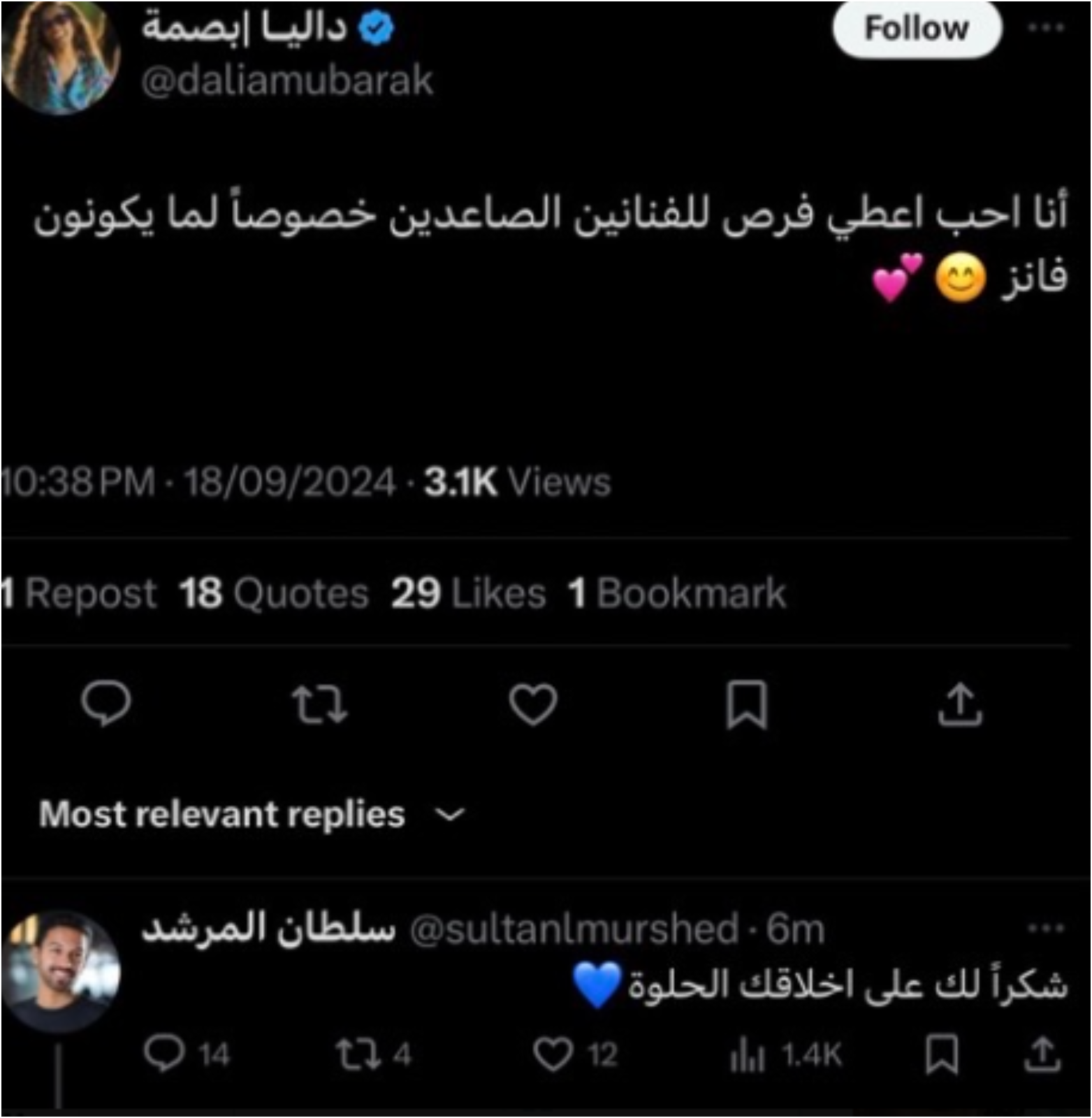 وعلى الفور، لم يتوانَ المرشد في رفض تعاونه مع داليا؛ نظرًا لعلاقة الصداقة التي تجمعه بيوسف، وكتب في منشور له عبر حسابه في منصة "إكس": "عايض اخ لي وقدوة واتعلم منه الكثير دخلنا المجال هذا من حب ولا دخلنا هالمجال عشان نعتدي بالكلام على اي شخص سواءً فنان او غيره اعتذر عن العمل كل التوفيق لك يا داليا".