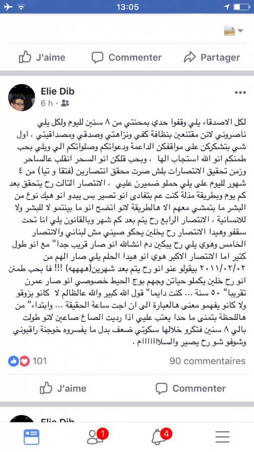 كتب ديب حرفيًا: "بحب قلكن انو السحر انقلب عالساحر وزمن تحقيق الانتصارات بلش. صرت محقق انتصارين (فتقا وتيا) من ٤ شهور لليوم على يلي حملو ضميرن عليي، الانتصار التالت رح يتحقق بعد كم يوم وبطريقة مذلة. كنت عم بتفادى انو تصير بس يبدو انو هيك نوع من البشر ما بتمشي معهم الا هالطريقة لانو اتضح انو ما بينتمو لا للبشر ولا للانسانية. الانتصار الرابع رح يتم بعد كم شهر وبالقانون يلي انا تحت سقفو وهيدا الانتصار رح يخلين يحكو صيني مش لبناني والانتصار الخامس وهوي يلي رح يبكين دم انشالله انو صار قريب جًدا".