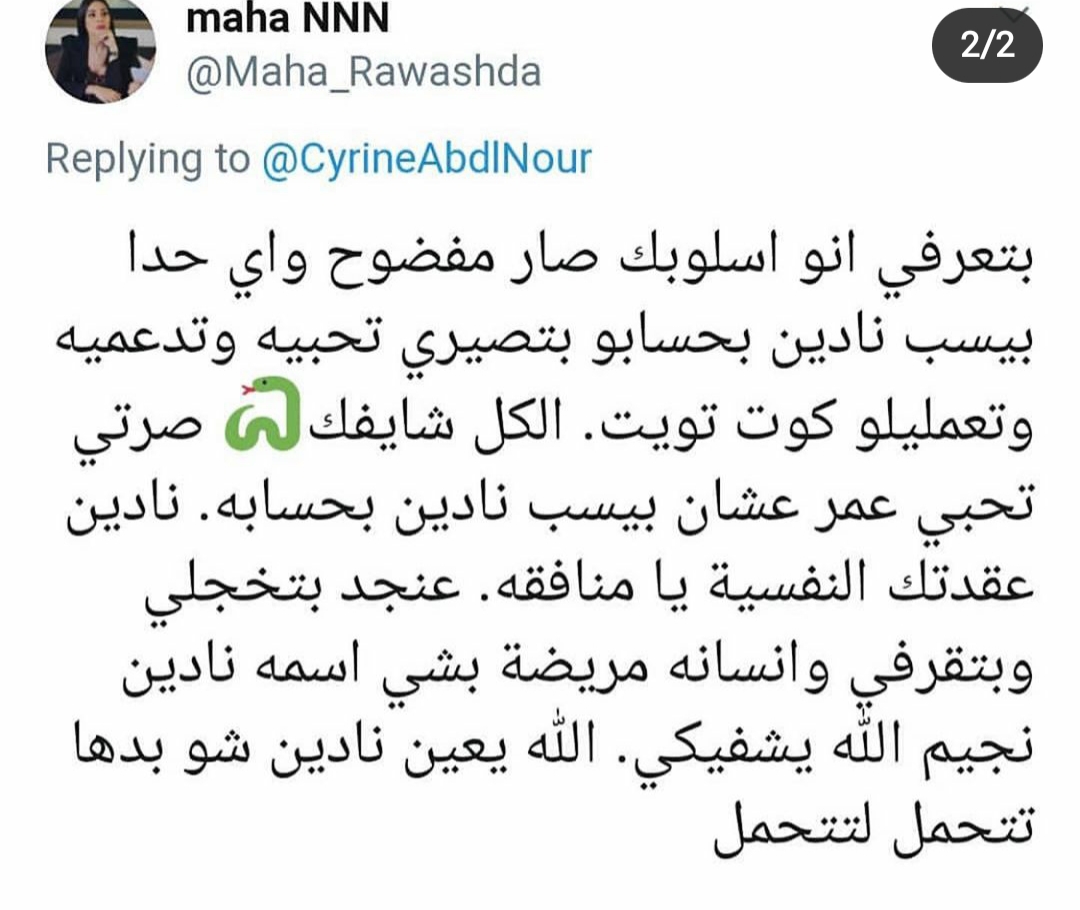 الله يعين نادين على وحدة متلك قليلة ادب ومخيلتها واسعة انتو ناس بدكن ترباية ما حداً غيركن بشوه صورة نادين بين زملاءها ما تركين حداً من شركن ومحبتي مجانية مش عن مصلحة بعد ناقص تحللو محبتي كمان روحو عيشو حياتكن حاج بقى ناطريني على كل تويت وكل مقبلة لتحللوها ضد نادين https://t.co/7i3uNbb7gG
