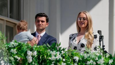 وظهرت تيفاني وهي تحمل طفلها البالغ من العمر نحو 11 شهرًا، إلى جانب زوجها مايكل بولوس، في الحديقة الجنوبية للبيت الأبيض، حيث التُقطت لهما صور عائلية مميزة.