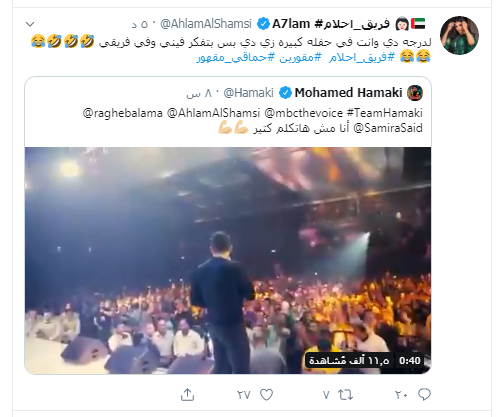 وأثار هذا المقطع الفنانة الإماراتية أحلام، التي لم تصمت تجاه مع فعله محمد حماقي، لتؤكد على أنها من أقوى المنافسين على اللقب وأن "حماقي" فعل ذلك كونه يتخوف منها بالأخص.