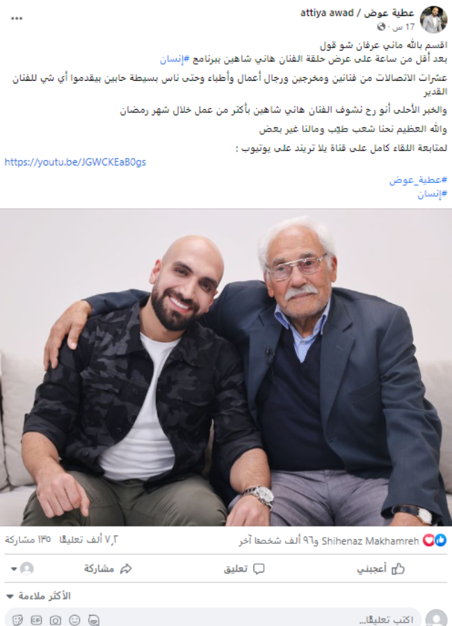 وكتب عوض في منشوره: "اقسم بالله ماني عرفان شو قول.. بعد أقل من ساعة على عرض حلقة الفنان هاني شاهين ببرنامج إنسان.. عشرات الاتصالات من فنانين ومخرجين ورجال أعمال وأطباء وحتى ناس بسيطة حابين بيقدموا أي شي للفنان القدي".