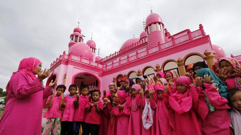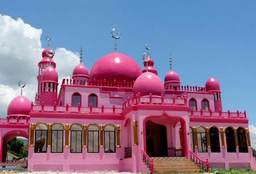 ويعود تاريخ بناء هذا المسجد إلى عام 2014 م، حيث تم تمويله من قبل رئيس بلدية المدينة الراحل "سامسودين ديماكوم؛ والذي كان مشهورًا باسم "العمدة الوردي"، وكان معروفًا بعشقه لهذا اللون الوردي، ولأنه كان يرى أن هذا اللون هو رمز للحب والسلام.