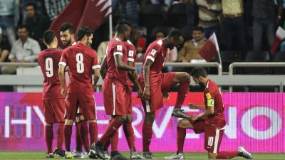 لاعبو قطر يحتفلون بهدف الهيدوس
