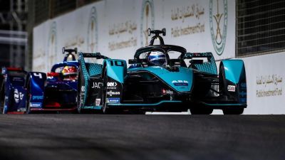 فاز البريطاني سام بيرد من فريق جاغوار ريسينغ بالجولة الثانية من الموسم السابع لبطولة العالم لسباقات فورمولا إي، المخصصة للسيارات الكهربائية 100 بالمئة، في مدينة الدرعية السعودية.