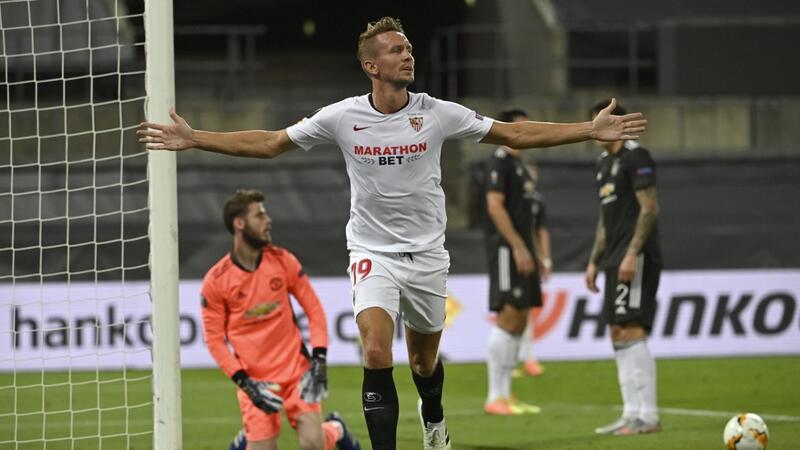 لوك دي يونغ يحتفل بهدفه الثمين في شباك دافيد دي خيا حارس مانشستر يونايتد الذي منح به فريقه إشبيلية بطاقة التأهل لنهائي الدوري الأوروبي.