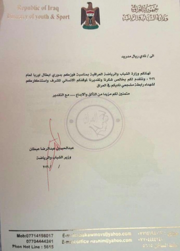 وهنأ وزير الشباب والرياضة العراقي ريال مدريد على تحقيقه لقب دوري أبطال أوروبا الـ 11 في تاريخه، قبل أن يشكره على التفاتته، حيث جاء في البرقية: "تهنئكم وزارة الشباب والرياضة بمناسبة فوزكم بدوري أبطال أوروبا لعام 2016 وتتقدم لكم بخالص شكرنا وتقديرنا لموقفكم الإنساني المشرف واستذكاركم لشهداء رابطة مشجعي ناديكم في العراق".
