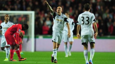 شيلفي لاعب سوانزي ونجم المباراة يحتفل بهدفه في مرمى فريقه السابق ليفربول