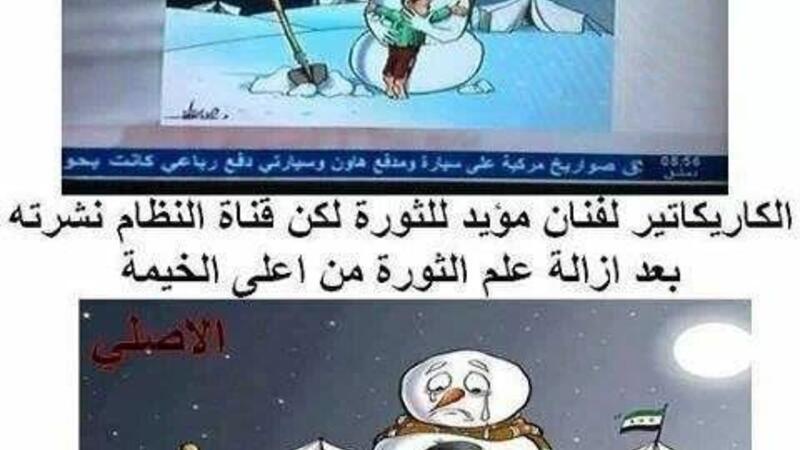 سرق التلفزيون العربي السوري التابع لنظام الأسد رسما كاريكاتوريا للزميل الرسام د. علاء اللقطة بعد أن ُزوّره وحذف منه علم الثورة السورية !