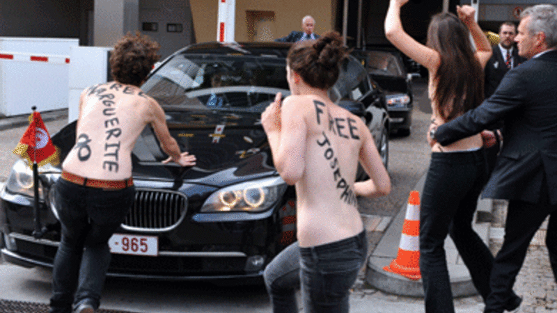 قامت ناشطات عاريات الصدر من حركة (فيمن) النسائية الثلاثاء بمهاجمة سيارة رئيس الوزراء التونسي علي العريض خلال زيارته لبروكسل، وذلك للاحتجاج على اعتقال زميلات لهن في تونس.