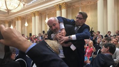 أخرج أفراد من جهاز الأمن الناشط السياسي والكاتب الأمريكي سام حسيني، اليوم الإثنين، بالقوة، من القاعة التي شهدت لقاء الرئيسين الأمريكي دونالد ترامب والروسي فلاديمير بوتين في إطار قمة هلسنكي؛ بسبب لافتة حملها بين يديه.