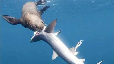 في مشهد مثير للاستغراب، تحوّل المفترس الى فريسة عندما شنت فقمة هجوماً مباغتاً على سمكة قرش والتهمتها في غضون دقائق معدودة!