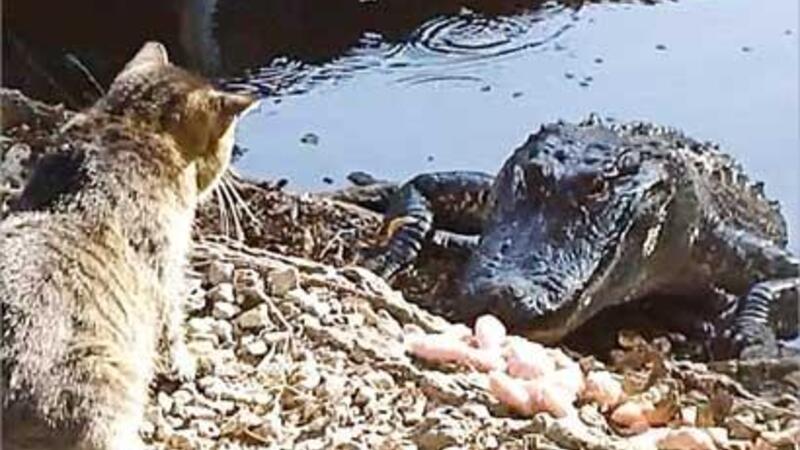 وعلى مدى 5 دقائق، استمر القط الشجاع في توجيه الضربات الى أنف التمساح الذي وجد صعوبة بالغة في التهام الوجبة بسبب المقاومة العنيفة من جانب «غريمه» الأضأل حجماً.