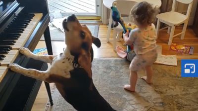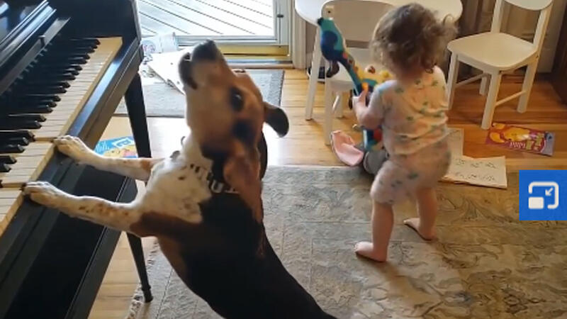 أظهر مقطع فيديو كلباً يغني على انغام موسيقية، فيما يحاول العزف على البيانو أيضاً.