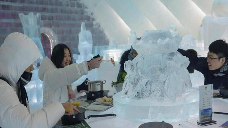وقد جرى صنع جميع الغرف والطاولات والكراسي والطاولات وحتى أكواب الشراب من الجليد، وفقا لما ذكرت صحيفة "الشعب" الصينية.