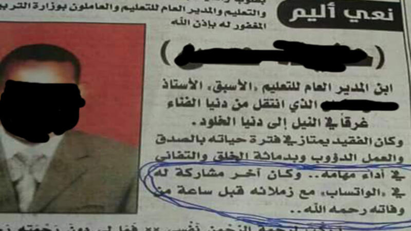 جاء في نعي طريف نقلته مواقع التواصل الاجتماعي ان " الوجيه فلان الفلاني رحل عن هذه الدنيا" .. وكان الفقيد يمتاز في حياته بالدماثة والصدق والعمل الدؤوب في اداء مهامه، وكانت اخر مشاركة له في " الواتساب" مع زملائه قبل وفاته بساعة رحمه الله.