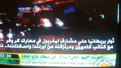 "‎قال التلفزيون الليبي الرسمي أمس: إن رئيس الوزراء البريطاني ديفيد كاميرون استخدم «مرتزقة من أسكتلندا وإيرلندا» للتصدي لأعمال الشغب في انجلترا، وقال البرنامج الصباحي للتلفزيون الليبي في نبأ عاجل «ثوار بريطانيا على مشارف ليفربول في معارك كر وفر مع كتائب كاميرون ومرتزقة من إيرلندا وأسكتلندا… الله أكبر.»".