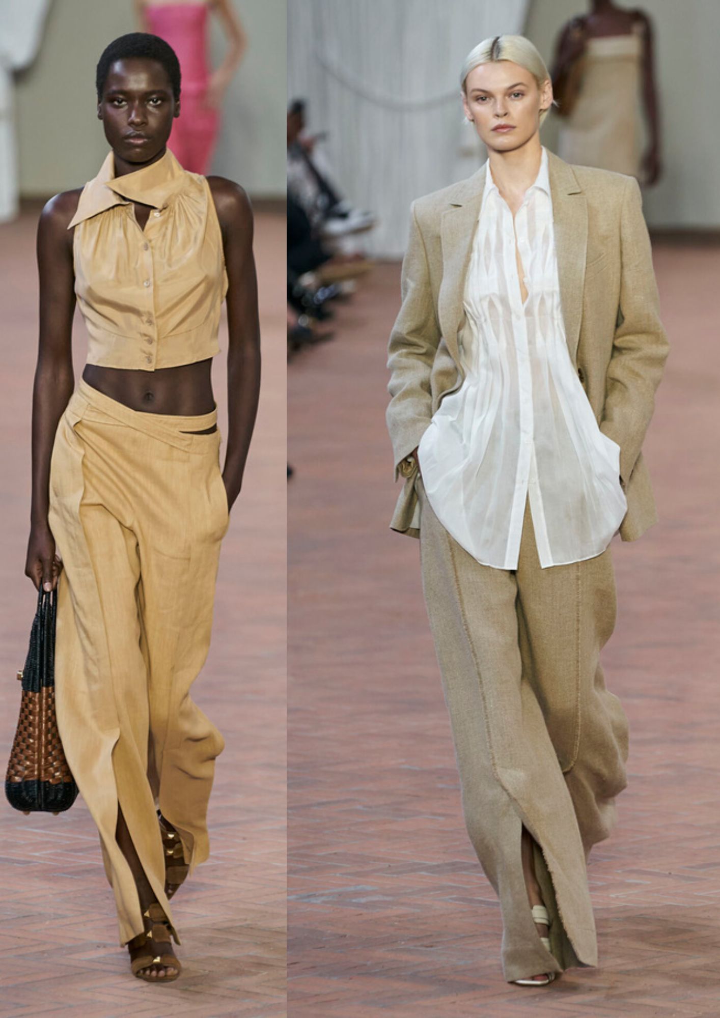 ورأينا العارضة الأنيقة "اوار أوديانغ" بصيحة الـ"جيليه" العصري باللون البيج المائل إلى الدرجة الصفراء الرملية الأنيقة التي نراها للمرة الاولى خلال أيام أسبوع الموضة لصيف 2024، كما تألقت العارضة الاميريكية "كارا تايلور" بطلة انيقة من "توكسيدو" نسائي بقصة غير متماثلة بصيحة البنطال الـ"أوفر سايز" مع قميص أبيض ناعم بنفس قماشة الفساتين التي عرضت سابقا.