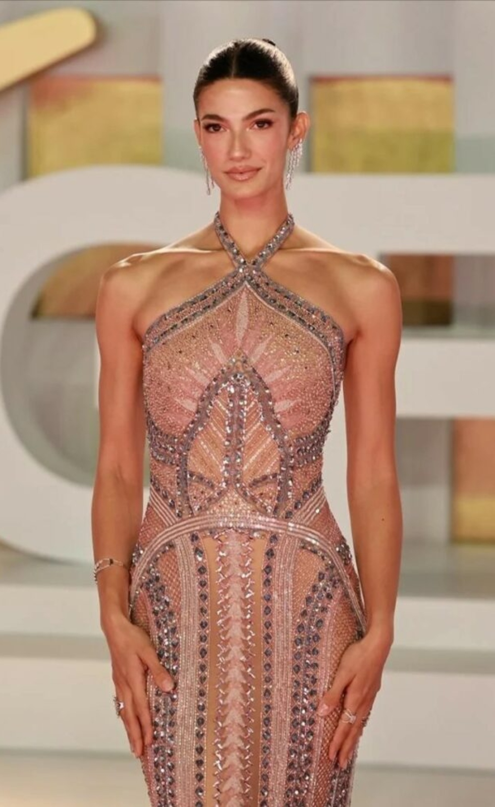 تألّقت مايان السيد بإطلالة مميزة وساحرة على السجادة الحمراء، حيث ارتدت فستان طويل باللون الذهبي وجاء لامعًا بقصة منسدلة تُبرز خصرها الرشيق. تميّز الفستان بتصميم عصري يمزج بين الكلاسيكية والبريق، فيما اكتمل جمال إطلالتها بمكياج ترابي ولمسة من الهايلايتر الذهبي الذي منح وجهها وهجًا متناغمًا مع لون الفستان. كما اختارت مايان تسريحة الشعر المموج الطبيعي، ما أضفى على ملامحها الشبابية أناقة هادئة وجاذبية لافتة.