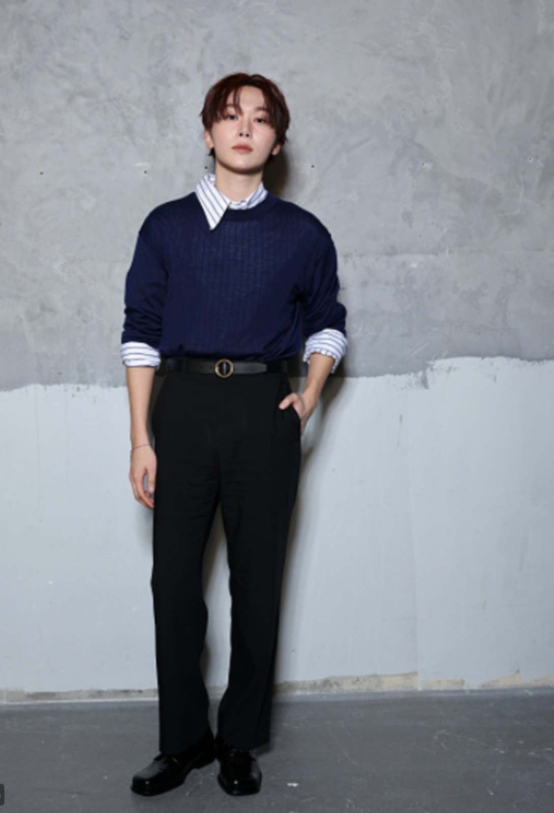 • مينغيو (Mingyu): مزج بين العصرية والكلاسيكية من خلال جاكيت صوفي بني، قميص أبيض وبنطال كحلي.