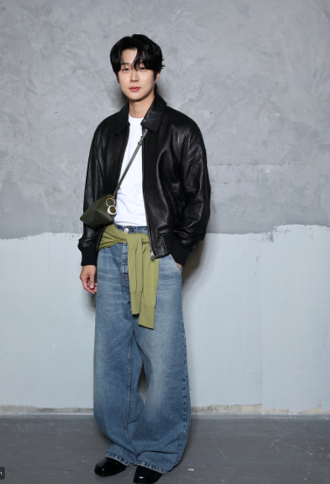 • تشوي وو شيك (Choi Woo Shik): اعتمد أسلوبًا جريئًا يجمع تيشيرت أبيض، جاكيت جلدي أسود وبنطال جينز، مع لمسة عصرية عبر التوب الأخضر وحقيبة Crossbag.