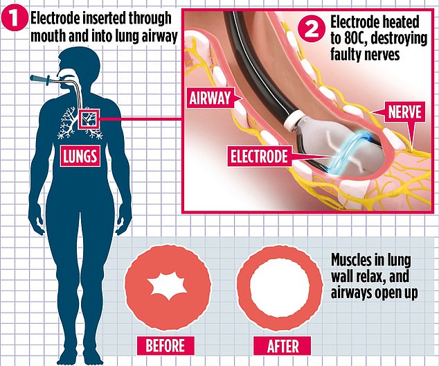 ويتضمن العلاج الجديد، الذي يسمى Nuvaira ويستمر لمدة ساعة واحدة، إدخال جهاز في الشعب الهوائية لتدمير الأعصاب مفرطة النشاط في الرئتين التي تسبب صعوبات في التنفس.