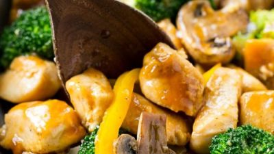 في وعاء صغير ، يخفق مرق الدجاج والسكر وصلصة الصويا وزيت السمسم ونشا الذرة ،
