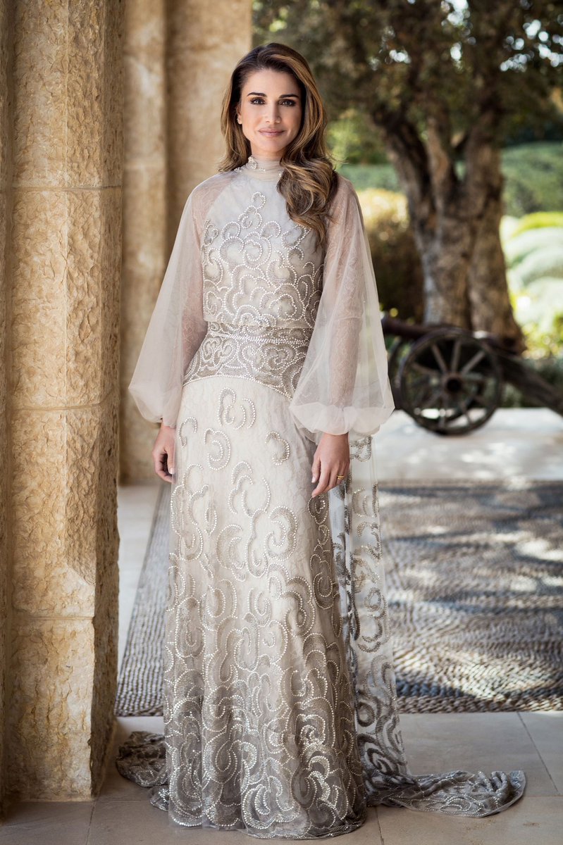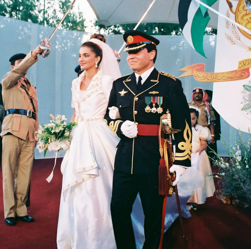 بإطلالة ساحرة أطلت الملكة رانيا العبدالله في يوم زفافها بفستان زفاف من التافتا البيضاء النقية وتطريز مذهب يمتد من الياقة العريضة التي ميزت التصميم إلى نهاية الطيات الموجودة على نهاية الفستان وطرحة من التول الأبيض الفاخر وقفازات يد أنيقة زادت من رقي الإطلالة الكلاسيكية الخالدة في الذاكرة.