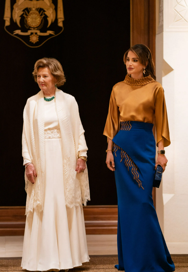 في حفل عشاء أقيم على شرف الزيارة النرويجية إلى البلاد، ارتدت جلالة الملكة رانيا فستان من الساتان البرونزي غير اللامع وتنورة باللون الأزرق مطرة بتطريزات مستوحاة من الكوفية التقليدية وأقراط أذنين تيجان ألماسيين وساعة يد آبل.
