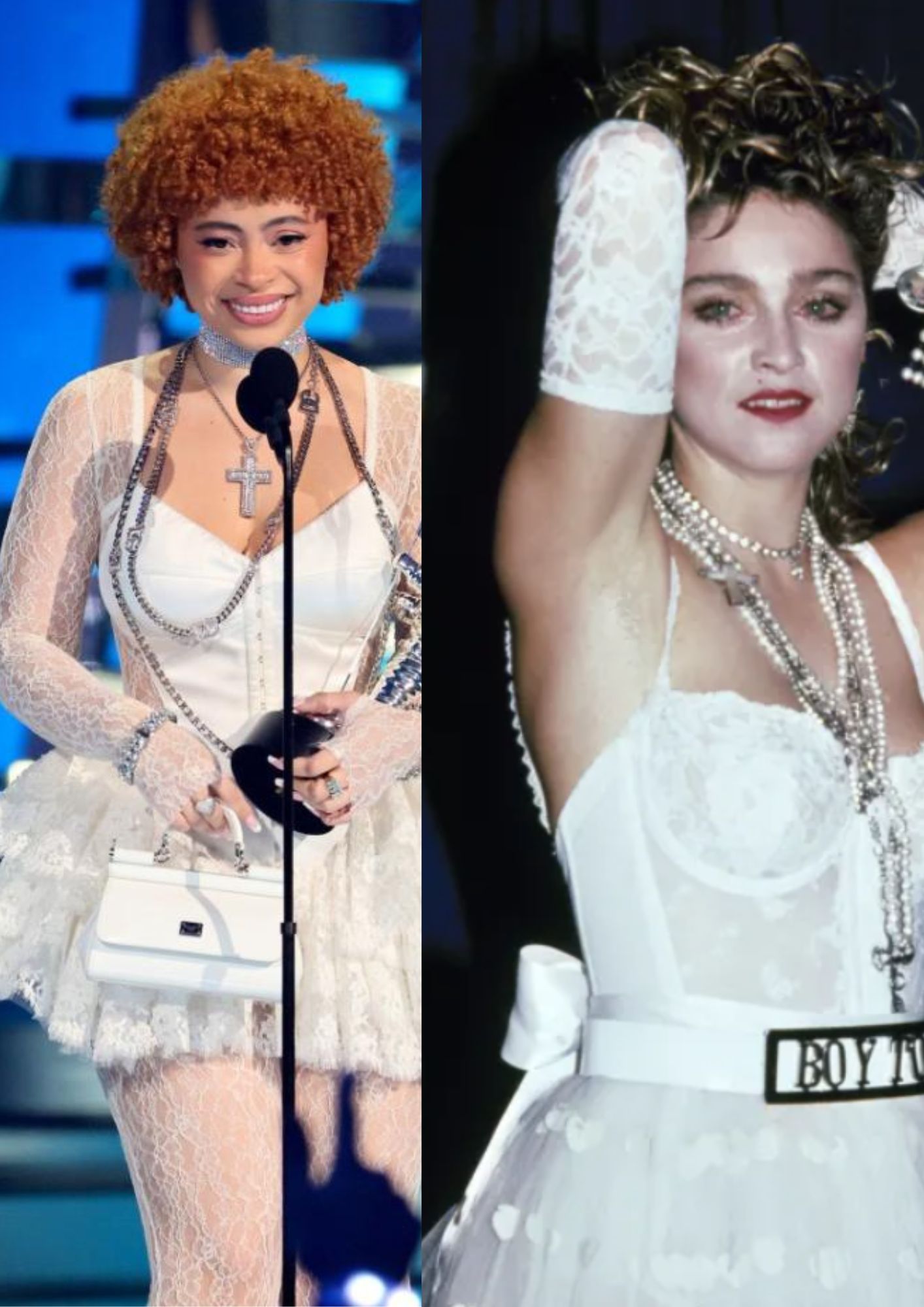 أطلت النجمة ذات الأصداء العالية والنجاحات المتوالية في عالم صناعة الموسيقى "الراب" آيس سبايس بإطلالة أعادت إلينا الحنين إلى إطلالات ملكة الـ"بوب" الأيقونية مادونا من إطلالتها في الفيديو كليب الخاص بأغنية "لايك أ فيرجن" بصورة أكثر عصرية وجرأة على أسلوب النجمة الشابة التي حطمت الأرقام بعدة أغاني ناجحة منها "برنسس ديانا" و "باربي" إلى جانب نيكي ميناج.