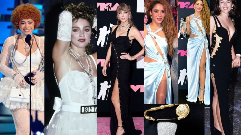 يبقى فستان "فيرساتشي" الأيقوني بالدبابيس التي تسمى دبابيس الأمان أو الـ(versace safety pin dress) تصميما أيقونيا وبمثابة بصمة خاصة بالدار الإيطالية العريقة التي تعنى بتصاميم الأزياء الأنثوية والجذابة.