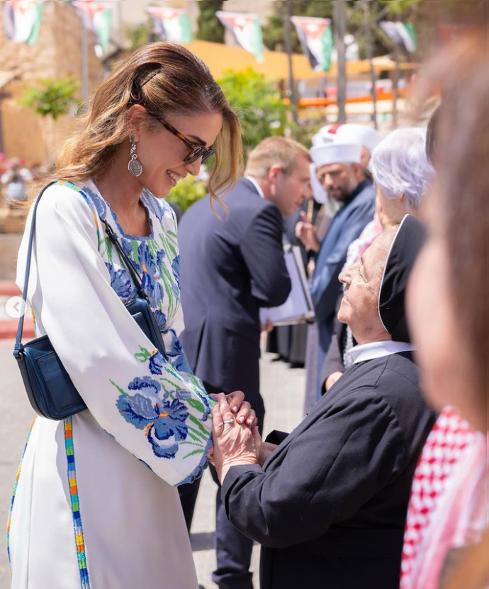 واختارت جلالة الملكة رانيا العبدالله أن تميز إطلالتها اليوم خلال زيارتها محافظة مأدبا في الشمال باختيار إطلالة الثوب الأردني المغمور بأجمل التطاريز الزرقاء الحيوية والتي اتخذت أشكالها وتفاصيلها من جمال الزهرة الأردنية الوطنية، زهرة السوسنة السوداء.