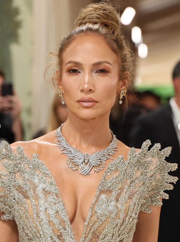 وصلت جينيفر لوبيز إلى السجادة الخاصة بحفل Met Gala للعام 2024 بإطلالة من ساحر الأزياء الراقية الباريسية (Haute Couture) دانيال روزبيري بإطلالة أزياء أيقونية وراقية للغاية بفستان مرصع بالكامل باللؤلؤ والكريستالات اللامعة والشفافة.